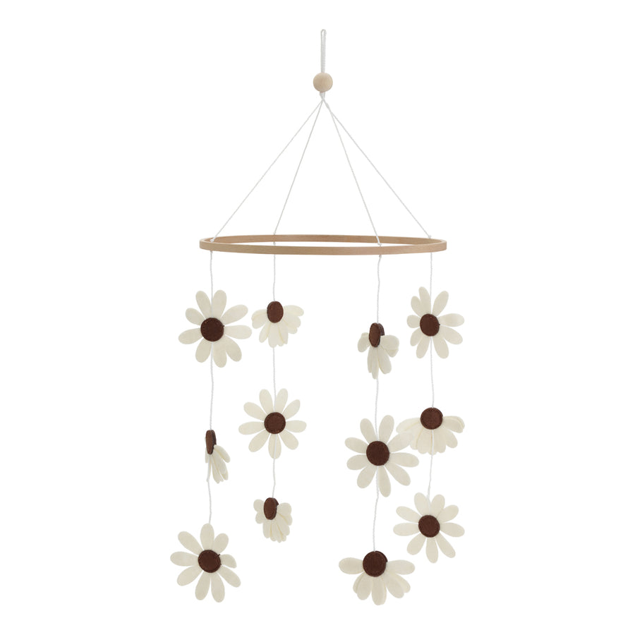 De decoratieve handgemaakt baby mobieltje met mooie bloemetjes dat kan worden opgehangen boven de comode of boven het bedje om iets rustgevend te creëren om naar te kijken.